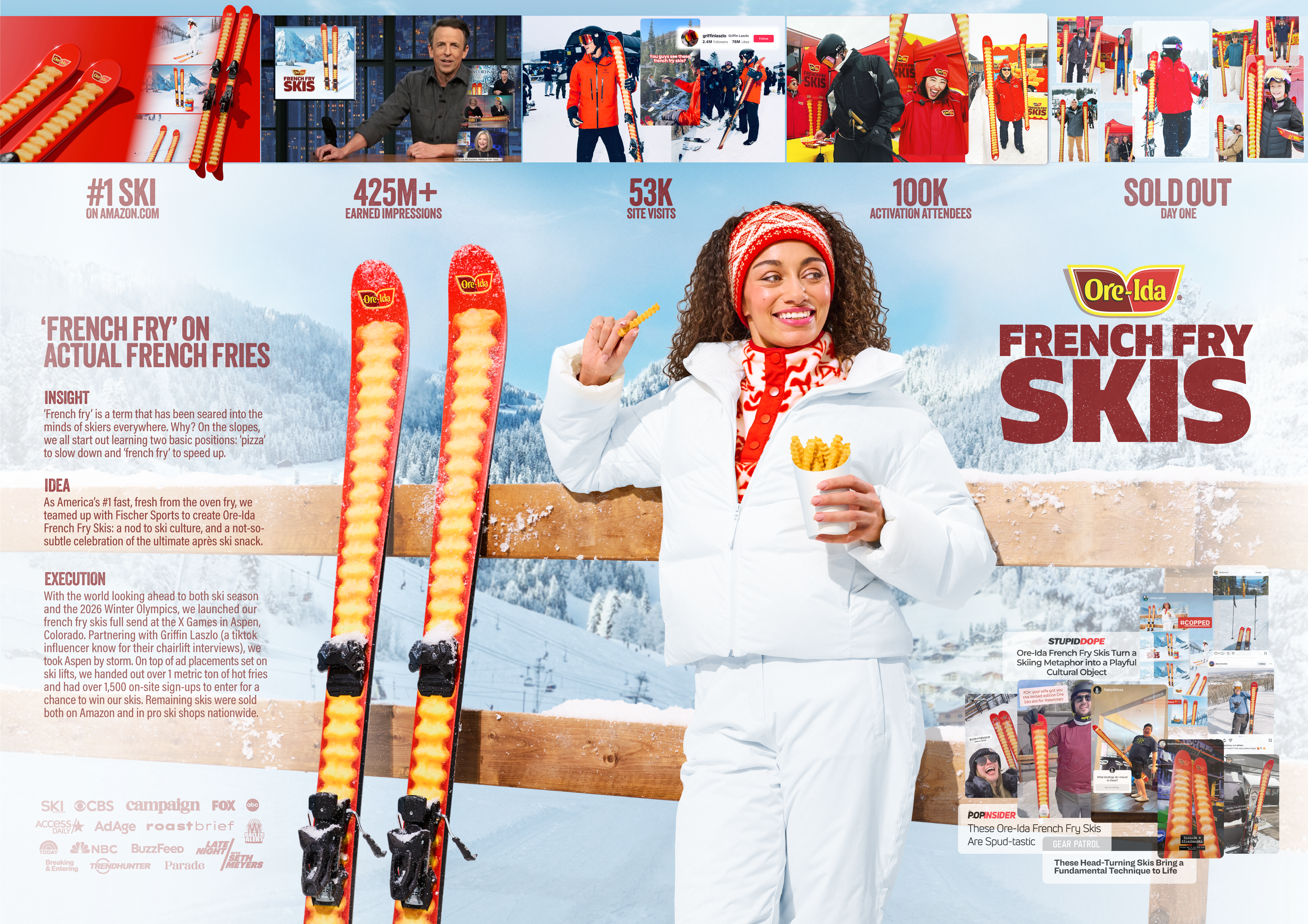 Since Ore-Ida is America's #1 fast, fresh from the oven fry, we brought that experience to the mountains. In partnership with fischer sports, we created custom french fry skis – letting people master 'french fry' on actual french fries.